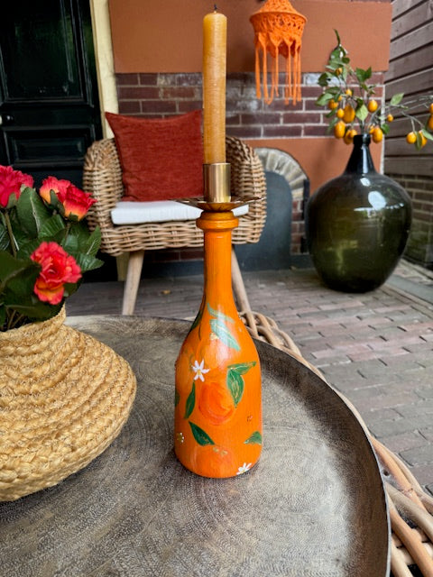 Een speelse en stijlvolle kandelaar, handgeschilderd en geïnspireerd op de warme kleuren van een sinaasappel. Elke kandelaar is uniek door het ambachtelijke schilderwerk en de variatie in gebruikte flessen zoals wijn, champagne of andere bijzondere flessen.